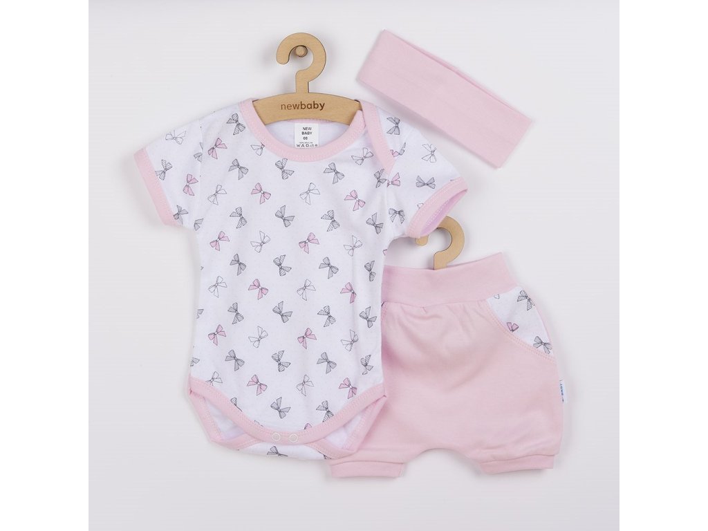 3-dielna dievčenská súpravička New Baby Perfect Summer. Súčasťou súpravičky sú kraťasky, body a čelenka. Body s krátkym rukávom je zdobené detským vzorom. Okolo krčku, rukávov a nožičiek je farebné lemovanie. Praktické zapínanie medzi nožičkami na cvočky. Roztomilé kraťasky majú v páse široký pružný lem. Na nohavičkách sú užšie pružné lemy a štýlový, ale praktický strih dodáva kraťaskám ten správny šmrnc. Čelenka je pružná, dobre sa prispôsobí, veľmi príjemne sa nosí a navyše dobre drží. Zloženie: 100% bavlna.Dodatočné parametre
