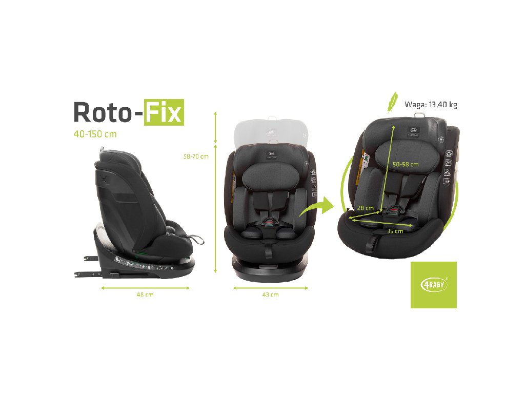 Autosedačka Roto-fix je integrovaná do 360 ° otočnej základne vybavenej systémom Isofix a popruhom Top Tether, vďaka čomu sa veľmi ľahko a rýchlo inštaluje a používa. Autosedačku Roto-fix je možné inštalovať proti smeru jazdy (RWF) až do výšky 105 cm (cca 4 roky), pričom bezpečnú a pohodlnú jazdu zaručuje 5polohové nastavenie sedadla v rozsahu 132-145 °. Cestovanie v smere jazdy je možné od 76 do 150 cm s 5-polohovým nastavením od 108° do 121°.