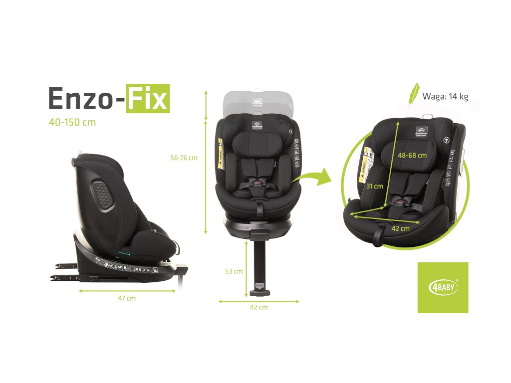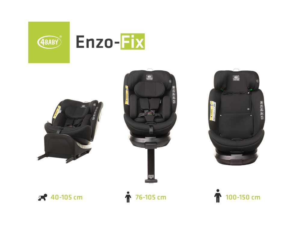 Sedačka 4BABY ENZO-FIX patrí do novej generácie autosedačiek, ktoré spĺňajú požiadavky najprísnejšej bezpečnostnej normy R129 / schválenie I-size. To zaručuje najvyššiu ochranu pre dieťa vysoké 40 až 150 cm. Enzo-fix je integrovaný s otočnou základňou vybavenou systémom Isofix a stabilizačnou nohou s indikátormi pre správnu inštaláciu. Funkcia otáčania o 360 ° umožňuje jednoduchú zmenu smeru jazdy zostavy, rovnako ako pohodlné upevnenie zostavy. bábätko k sedačke a vybratiu z auta Sedačka Enzo-fix sa inštaluje proti smeru jazdy (RWF) do výšky malého pasažiera 105 cm (tj približne 4 roky) a bezpečnú a pohodlnú cestu zaistí 5-stupňové nastavenie sedadla v rozsahu 132-145°. Pojazd v smere jazdy je však možný od 76 do 150 cm v 5-stupňovom nastavení v rozsahu od 108° do 121°.
