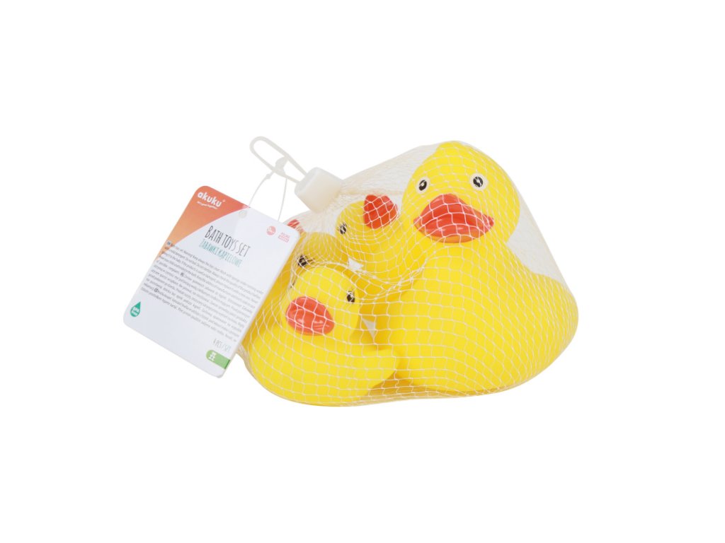 4 Krásne kačacie kačica z „Akuku“. Každé dieťa musí mať takú rodinu vo vani. Naša sada pozostáva zo 4 gumových hračiek: mama kačica a 3 malé kačice. Hra sa dieťa stretáva okolo sveta okolo nich. Každá hračka má otvor, cez ktorý je možné žiariť vodu. Zaoblené tvary zaručujú pri hraní bezpečnosť. Vyrobené z vysoko kvalitných a bezpečných materiálov. Pokyny na použitie: Po každom kúpeľni by sa malo dôkladne vytlačiť, aby sa zvnútra zbavila prebytočnej vody. Pri prvých príznakoch opotrebenia alebo poškodenia by sa mal produkt hodiť a nahradiť novým. Produkt je úplne bez bisfenolu A (0% BPA). Rozmer: Veľká kačica vysoká 9,5 cm, malé kačice s výškou 5 cm.Dodatočné parametre