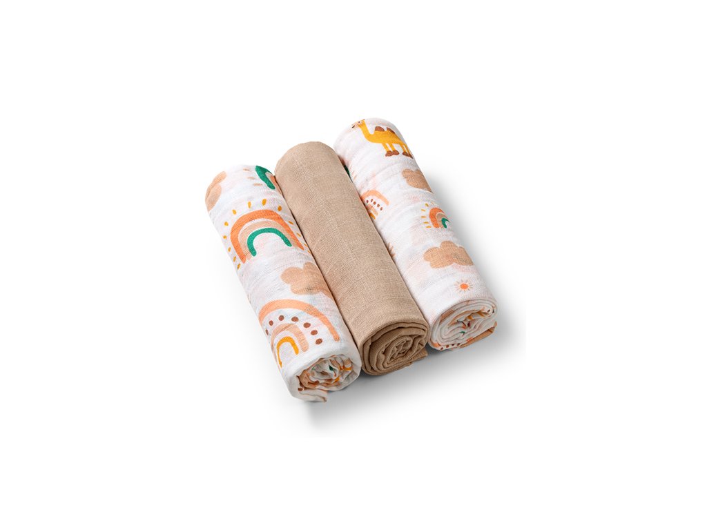Mušelínové plienky s dvoma hračkami sú vyrobené zo 100 % bavlny, ktorá sa vyznačuje mimoriadnou ľahkosťou a priedušnosťou. Sú nenahraditeľné v novorodeneckom aj detskom období.