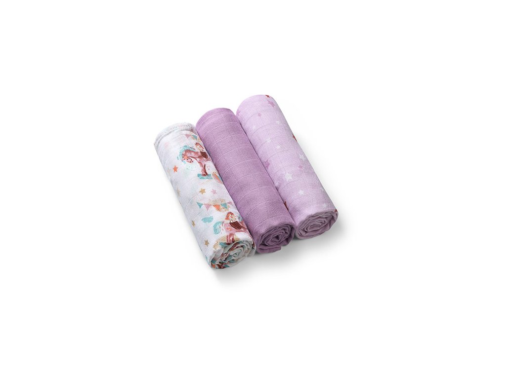 Súprava obsahuje 3 plienky: 2 z nich sú zdobené farebnými potlačami a jedna je jednofarebná. Bambusové vlákna vytvárajú mimoriadne mäkký a jemný povlak, ktorý je na dotyk porovnateľný s hodvábom. Bambus je jednou z najvzácnejších rastlín, ktorá je známa svojimi zdravými a upokojujúcimi vlastnosťami. Je to obnoviteľná a ekologická surovina. Rastie veľmi rýchlo, dokonca až 1 m za deň, a na jeho pestovanie sa nepoužívajú žiadne pesticídy. Bambus má antibakteriálne vlastnosti, vďaka ktorým je odolný voči zápachu. Vzhľadom na mäkkosť bambusových vlákien je potrebné dodržiavať primeranú teplotu prania, ktorá podmieňuje neporušenosť mäkkej štruktúry.
