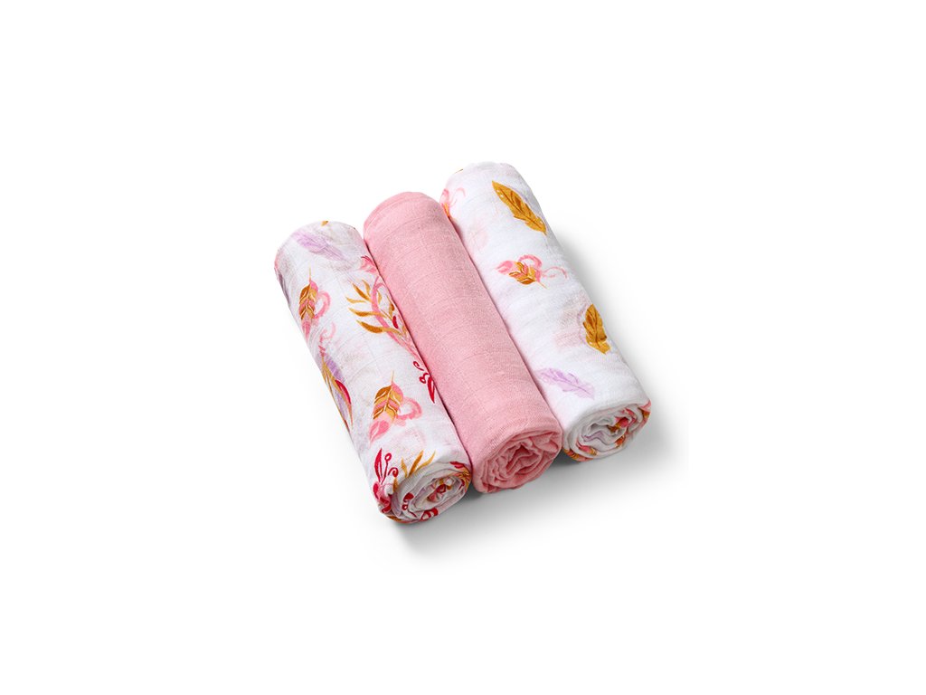Súprava obsahuje 3 plienky: 2 z nich sú zdobené farebnými potlačami a jedna je jednofarebná. Bambusové vlákna vytvárajú mimoriadne mäkký a jemný povlak, ktorý je na dotyk porovnateľný s hodvábom. Bambus je jednou z najvzácnejších rastlín, ktorá je známa svojimi zdravými a upokojujúcimi vlastnosťami. Je to obnoviteľná a ekologická surovina. Rastie veľmi rýchlo, dokonca až 1 m za deň, a na jeho pestovanie sa nepoužívajú žiadne pesticídy. Bambus má antibakteriálne vlastnosti, vďaka ktorým je odolný voči zápachu. Vzhľadom na mäkkosť bambusových vlákien je potrebné dodržiavať primeranú teplotu prania, ktorá podmieňuje neporušenosť mäkkej štruktúry.