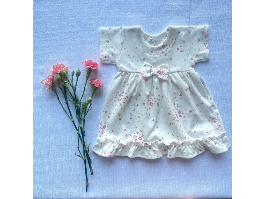 Jemná mašlička v páse, volánikový spodný lem a nežná kvietkovaná potlač dodávajú šatám romantický vzhľad. Skrytá vrstva body s patentkami medzi nožičkami zabezpečí, že sa šaty pri hre ani pri pohybe nevyhŕňajú a všetko zostáva na svojom mieste.