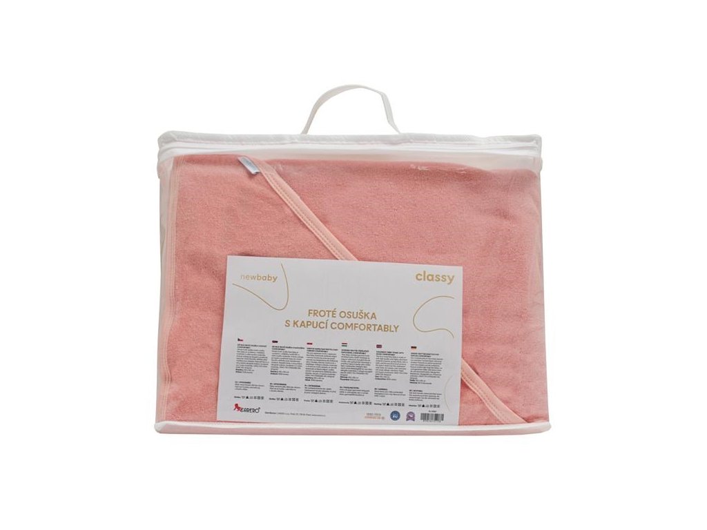 Krásna detská froté osuška New Baby je vyrobená z mäkkého, kvalitného a veľmi savého materiálu a preto je ideálna pre bábätká aj staršie deti. Osuška krásne zahreje po kúpeli a praktická kapucňa chráni hlavičku dieťatka pred nepríjemným chladom. Osuška dokonale absorbuje vlhkosť, pričom veľmi rýchlo schne. Nový ešte kvalitnejší materiál, z ktorého je osuška vyrobená nepúšťa farbu a nevyvoláva alergické reakcie. Vyrobená z 2 vrstiev materialu. Zloženie: 100% bavlna. Rozmery: 80 x 80 cm. OEKO-TEX STANDARD 100. 240g/m2. Dodávané v praktickom textilnom vrecku na zips. Výhodou je, že vrecko využijete napríklad na kozmetiku na cestách. Rozmer balenia je 37x27x8 cm.Dodatočné parametre