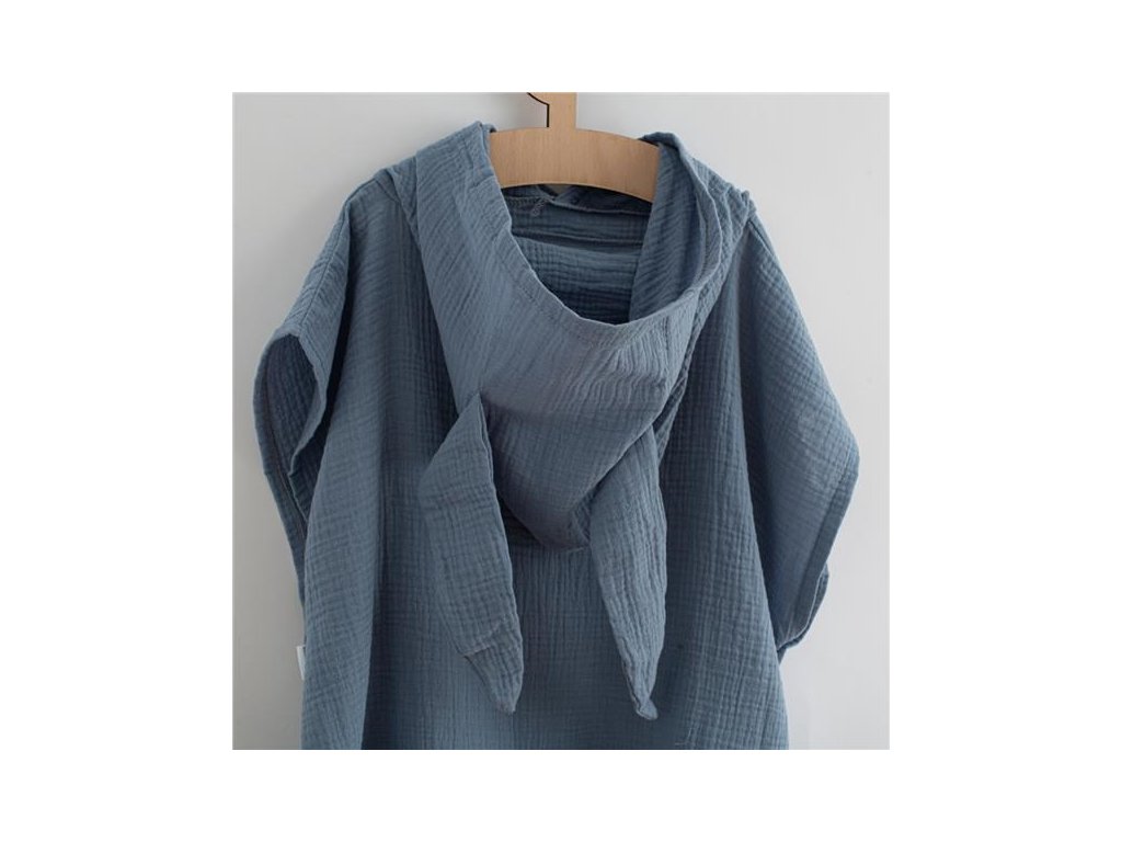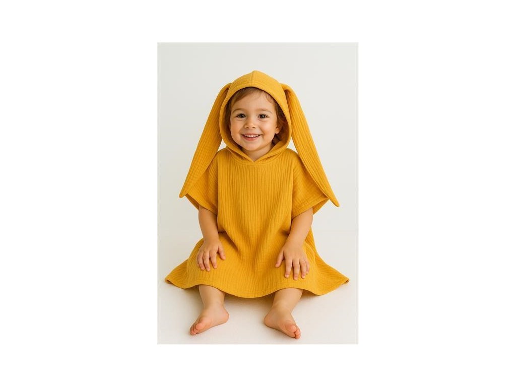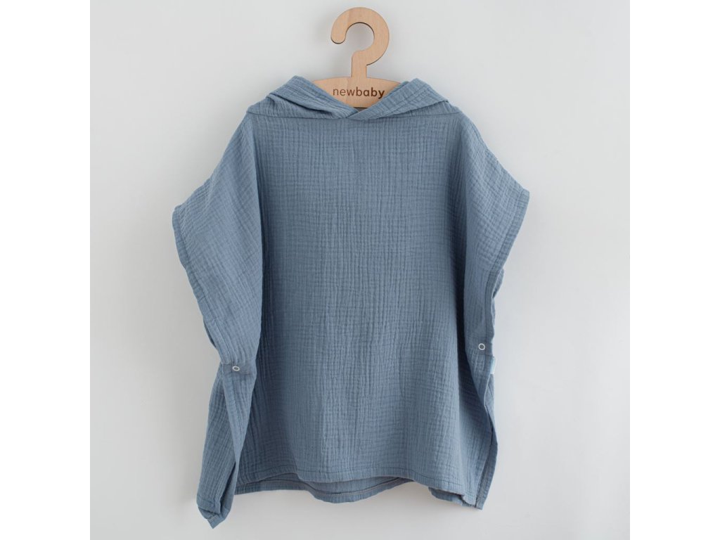 Detské mušelínové pončo New Baby Feeling. Štýlové pončo nielen na doma, ale aj na plávanie pri bazéniku, alebo pri vode. Mušelínové pončo je vďaka materiálu ľahké, vzdušné a krásne savé. Pončo bude chrániť dieťa pred chladom a poslúži aj ako jemná osuška. Vďaka voľnému jedinečnému strihu a roztomilým uškám urobí deťom veľkú radosť. Svojim strihom s dieťatkom porastie a padne na každú postavu. Vyzerá skvele a je možné využívať po celý rok. Pre ľahšie obliekanie a vyzliekanie sú na boku cvočky. Tým vznikne možnosť urobiť otvor na ruku, alebo nechať strih volný. Zloženie: mušelín-100% bavlna. Rozmer: 35 cm bez kapucne, šírka: 40 cm.