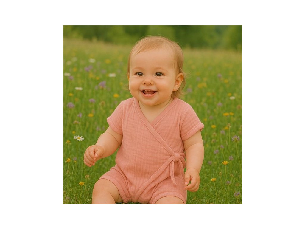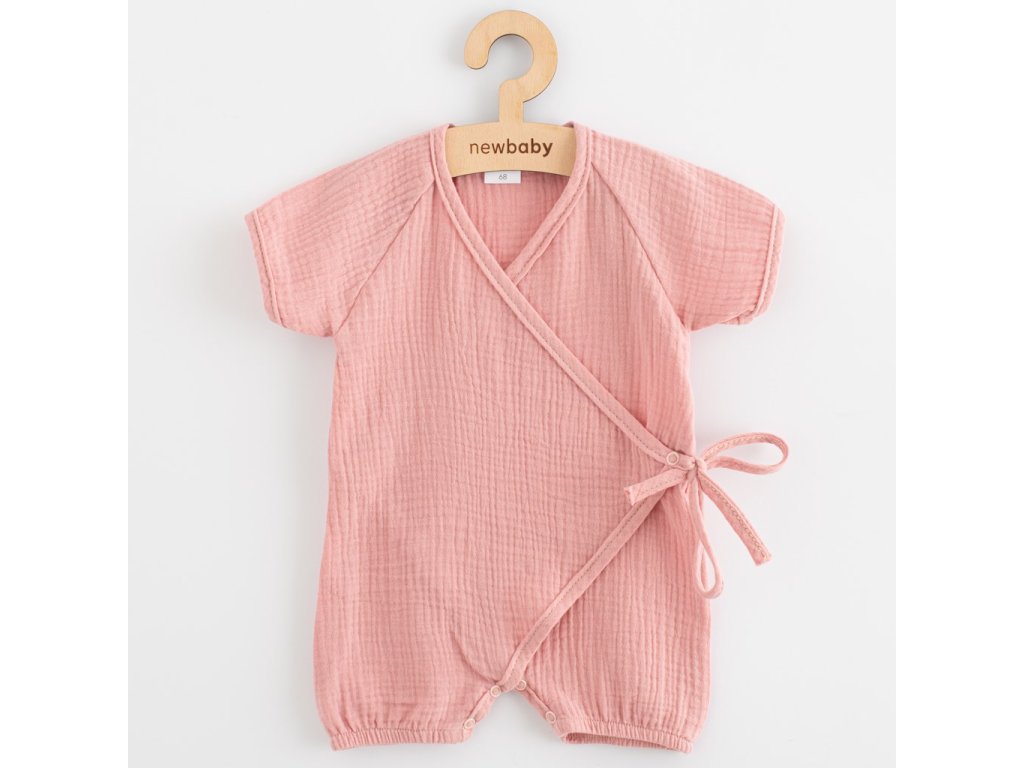 Štýlový letný mušelínový overal s krátkym rukávom New Baby. Zavinovací overálik s krátkym rukávom má praktické zaväzovanie na boku na šnúrky, z vnútornej strany na cvoček a medzi nožičkami na cvočky čo uľahčí obliekanie a prebaľovanie. Na nohavičkách sú jemné gumičky, ktoré ale netlačia na nožičkách. Super štýlový letný overal rozžiari každé bábätko.