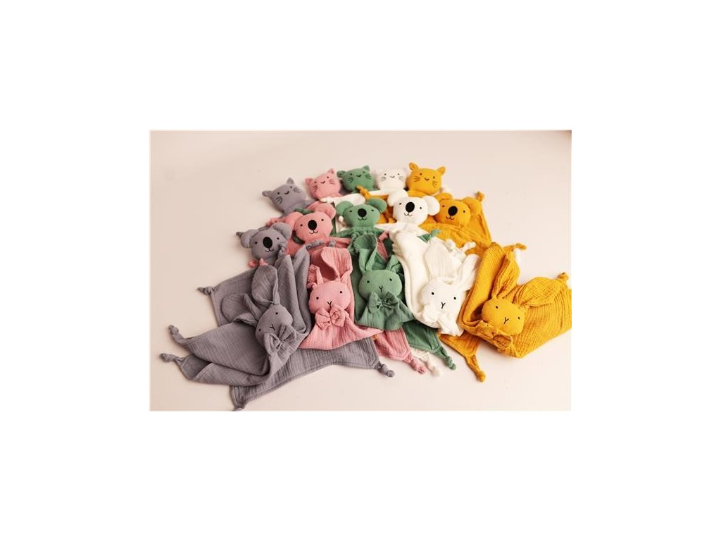Mušelínový usínáčik New Baby Cat je to ideálna plyšová hračka pre naše dieťa od prvých dní života. Vyrobená z mäkkej a na dotyk príjemnej mušelínovej tkaniny. Poskytuje pocit bezpečia a uľahčuje zaspávanie. Mäkký vzhľad a estetické farby zabezpečujú estetický a minimalistický dizajn. Plyšová hračka sa dokonale hodí k našim ostatným mušelínovým výrobkom a vytvára krásnu súpravu, ktorú možno darovať ako darček na oslavu narodenia dieťaťa.
