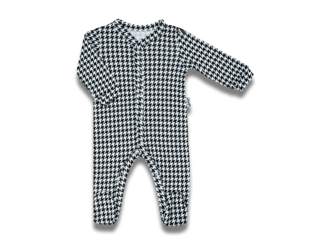 Štýlový bavlnený dojčenský overal s dlhým rukávom v modernom čierno-bielom pepito vzore „houndstooth“. Vyrobený z jemnej a kvalitnej bavlny, ktorá je príjemná k citlivej detskej pokožke. Overal sa zapína na praktické cvočky po celej dĺžke a medzi nožičkami, čo uľahčuje obliekanie aj prebaľovanie. Tento kúsok je ideálny na každodenné nosenie aj ako pohodlný spánkový overal.