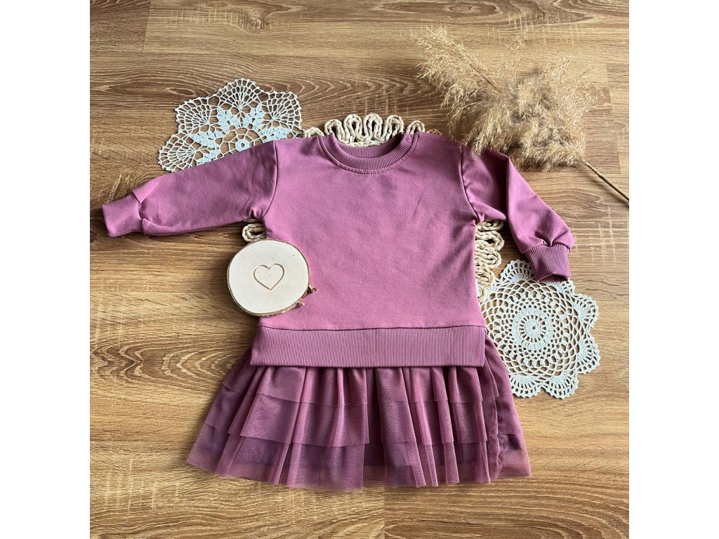 Tieto ružové teplákové šaty kombinujú mäkký, pružný vrch s romantickou tylovou sukničkou. Perfektné na každodenné nosenie aj špeciálne chvíle.