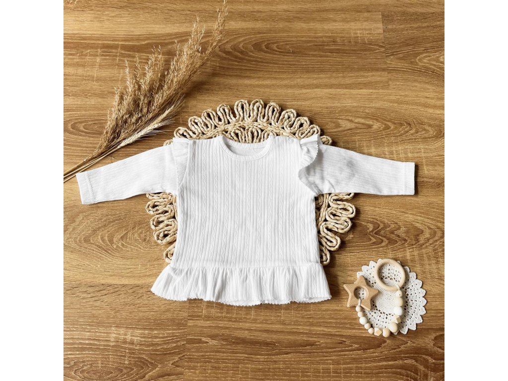 Toto elegantné tričko s volánmi je vyrobené z vysoko kvalitnej organickej bavlny, ktorá je ľahká, príjemná na dotyk a šetrná k detskej pokožke. Volány na rukávoch dodávajú tričku jemný, dievčenský vzhľad, zatiaľ čo zapínanie na gombíky okolo krku zabezpečuje pohodlné obliekanie.